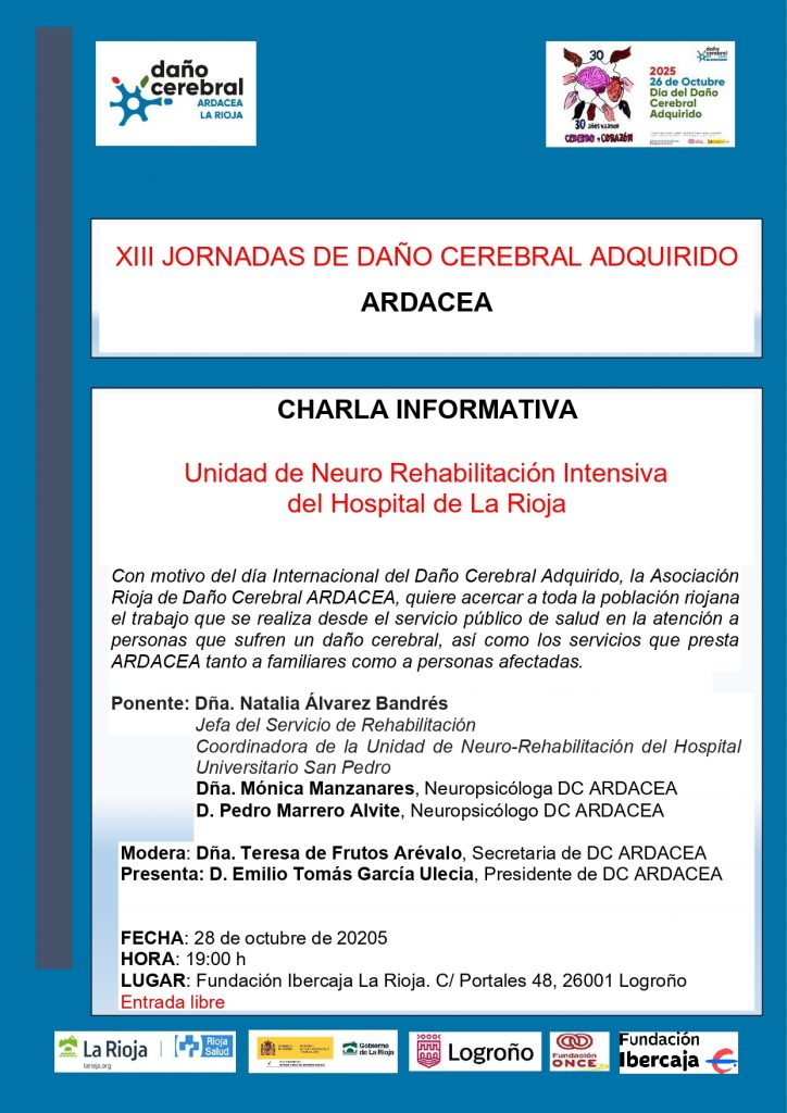 Con motivo de la celebración del Día Nacional del Daño Cerebral, el próximo 26 de octubre, la asociación Daño Cerebral Ardacea La Rioja ha organizado las que son ya las XII jornadas sobre daño cerebral en La Rioja. El martes 28 de octubre: Salón de actos de la Ibercaja en la calle Portales 48 de Logroño El sábado 25 de octubre : Mesas informativas en Paseo del Mercadal de Calahorra y Plaza del Mercado de Logroño.