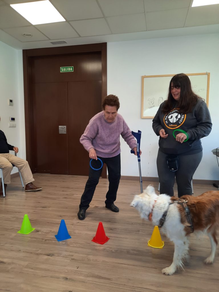 R. La hacemos con la asociación Dejando Huella. La terapia consiste en interactuar con el perro. Lo cepillan, juegan con él, le lanzan pelotas, le dan órdenes esconden objetos para que el perro lo encuentre y, al mismo tiempo, ellos recuerden dónde lo han escondido …