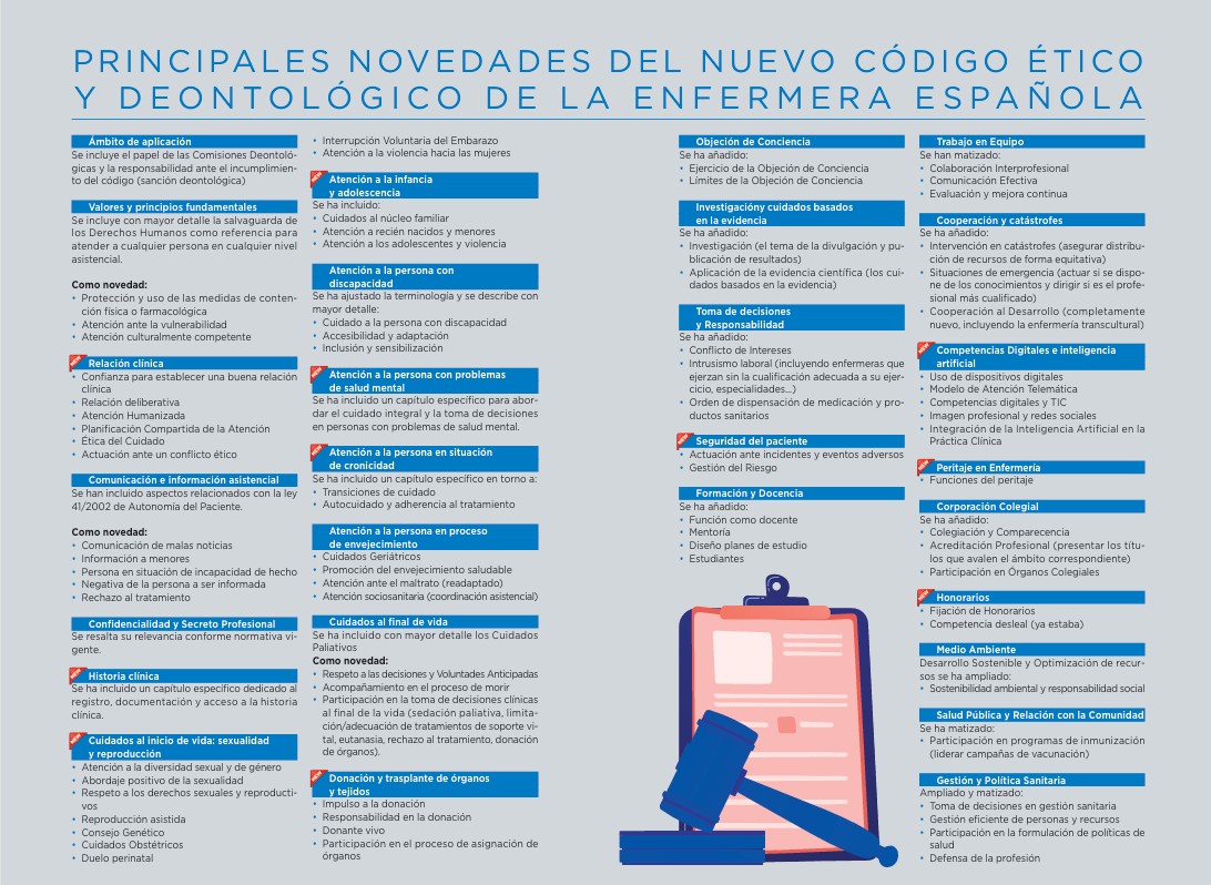 - “Entre los nuevos temas se incluyen aspectos relativos a la relación clínica, cuestiones genéticas, reproducción asistida, atención obstétrica, atención a la adolescencia, sexualidad y reproducción, cuidados al final de la vida, trasplante de órganos, seguridad del paciente, funciones como la docencia y el rol del estudiantado, competencias digitales e inteligencia artificial, cooperación, peritaje y salud global”, detalla Tayra Velasco, presidenta de la Comisión Deontológica Nacional de Enfermería.
